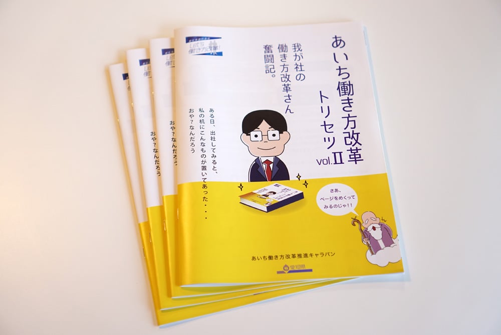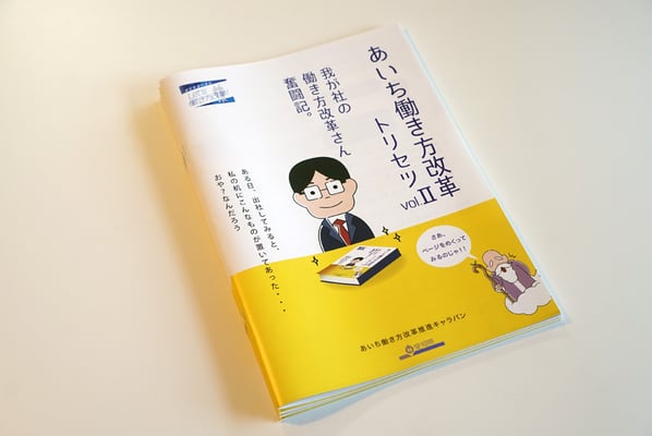 愛知県労働局福祉課から発行されている、あいち働き方改革推進キャラバンの冊子制作を担当させていただきました。本案件は、NPO法人ブルーバード様からご依頼をいただき、ブルーバード様と協力関係の元、制作を行いました。