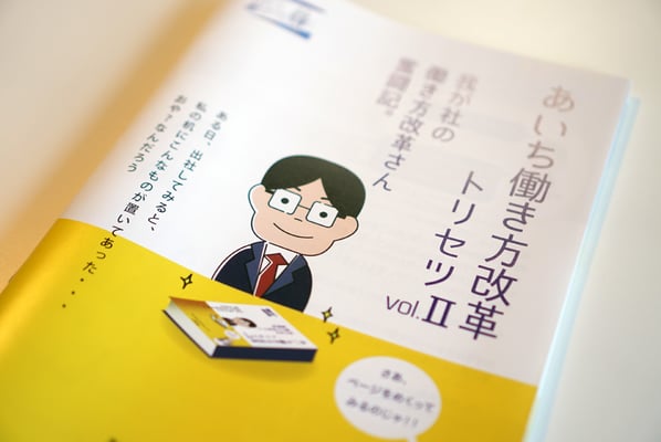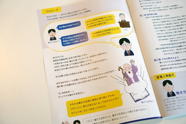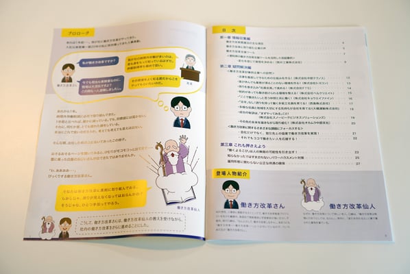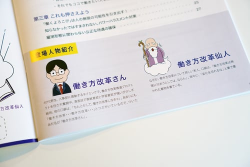 結果、「我社の働き方改革さん奮闘記。」というサブ見出しがつき、「働き方改革さん」「働き方改革仙人」というキャラクターが生まれました。この二人の掛け合いでストーリーが進行し、働き方改革について理解できるという仕組みになっています。