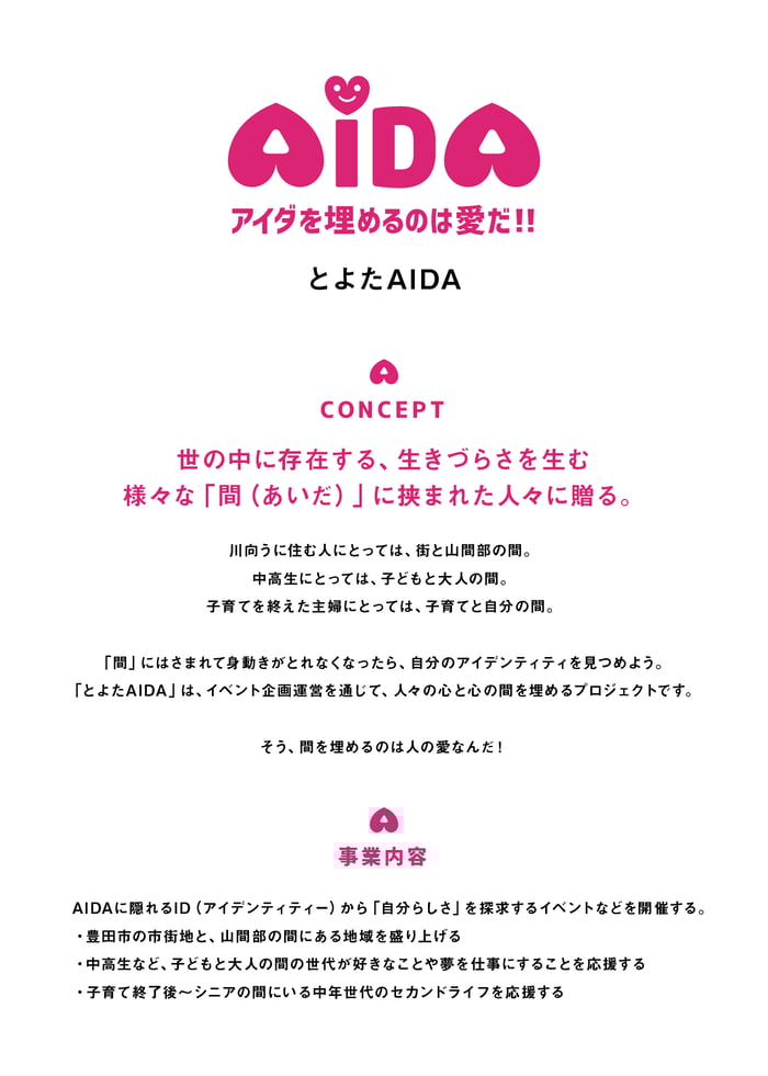 団体のロゴマーク、キャッチフレーズ、ウェブサイト、それからイベントを開催していく中で必要なもろもろの制作物をつくっていきました。まだ生まれたばかりのとよたAIDAには実体がありません。だからこそ、とよたAIDAが生まれるに至った根底にある想い、そして、とよたAIDAがこの先の未来、何を目指していくのかというビジョン、その二つの線を結ぶようにしてデザインをしました。