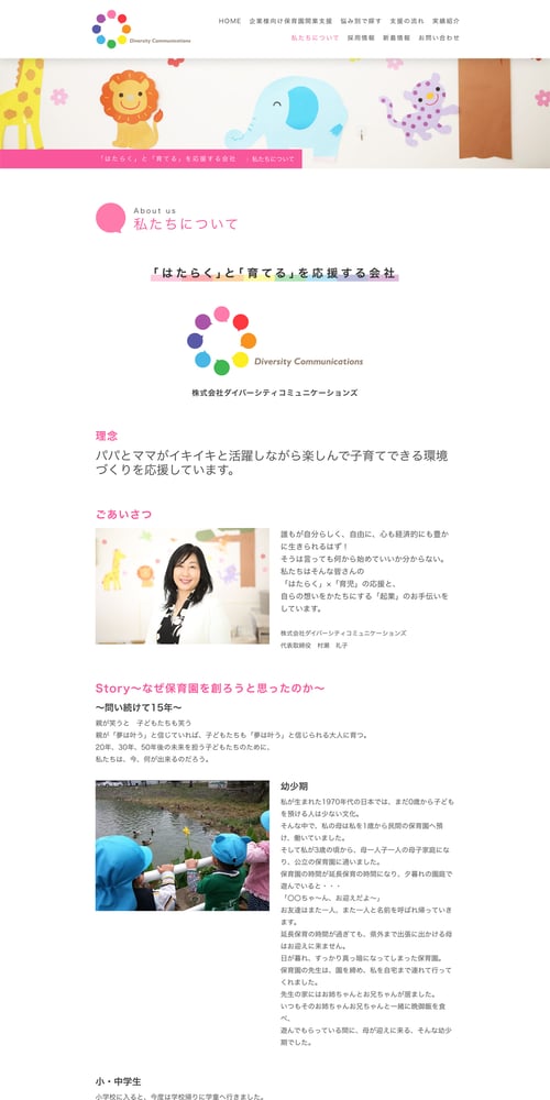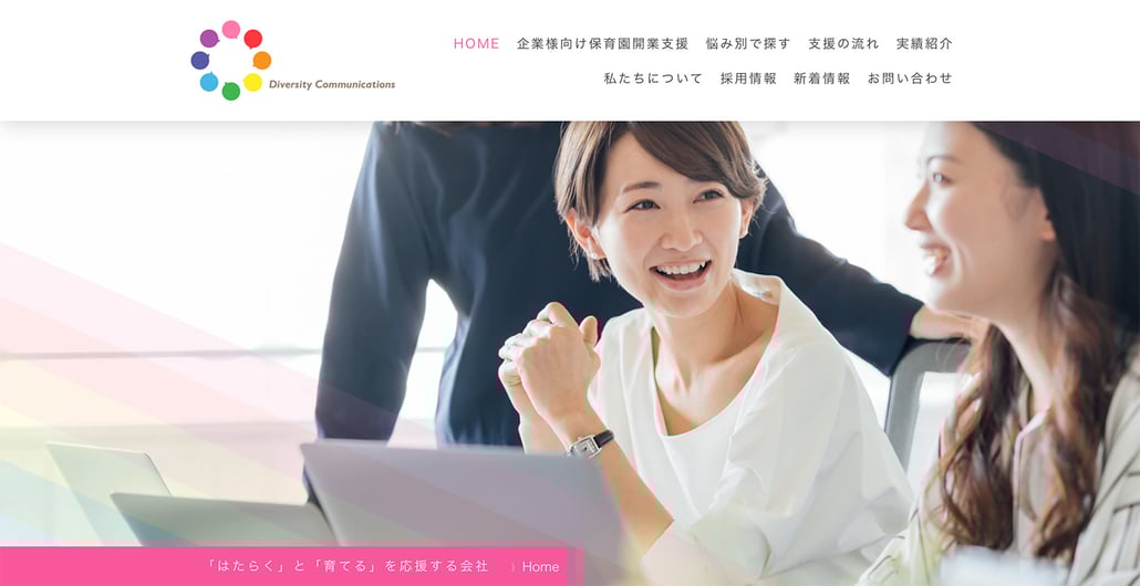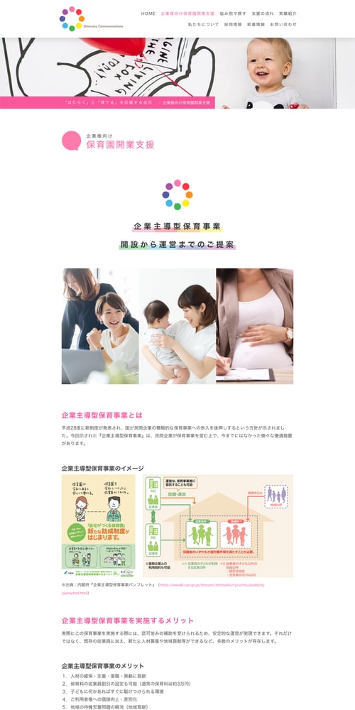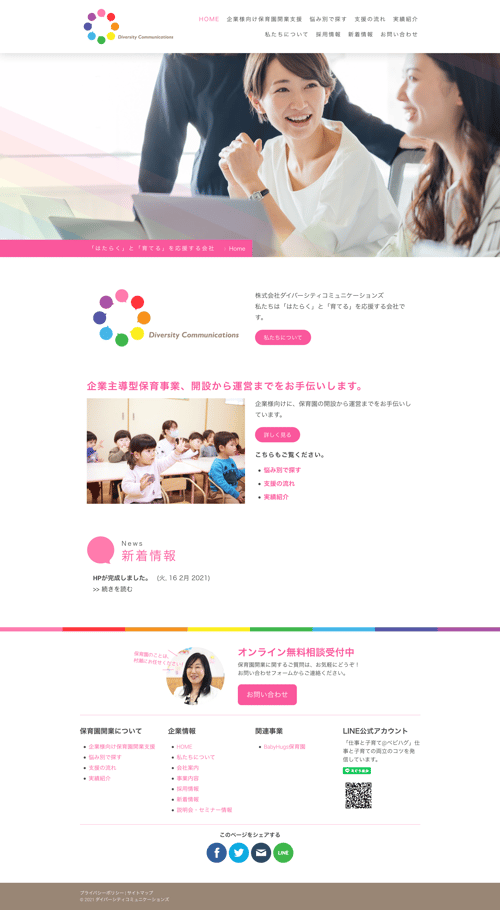 株式会社ダイバーシティコミュニケーションズ様からのご依頼で、ホームページとロゴマーク制作を担当させていただきました。制作の目的は、事業の整理&発信と、企業主導型導入サポートの打ち出しでした。