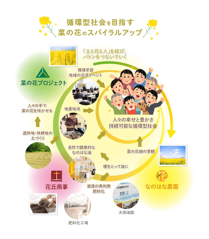 次に、3つの事業の関わりを、一枚のグラフィカルなビジュアルとして表現しました。タイトルは「循環型社会を目指す 菜の花のスパイラルアップ」。比較的若い年齢層の方にも理解していただけるよう意識しました。