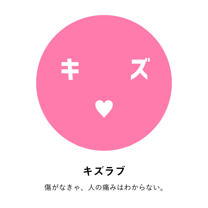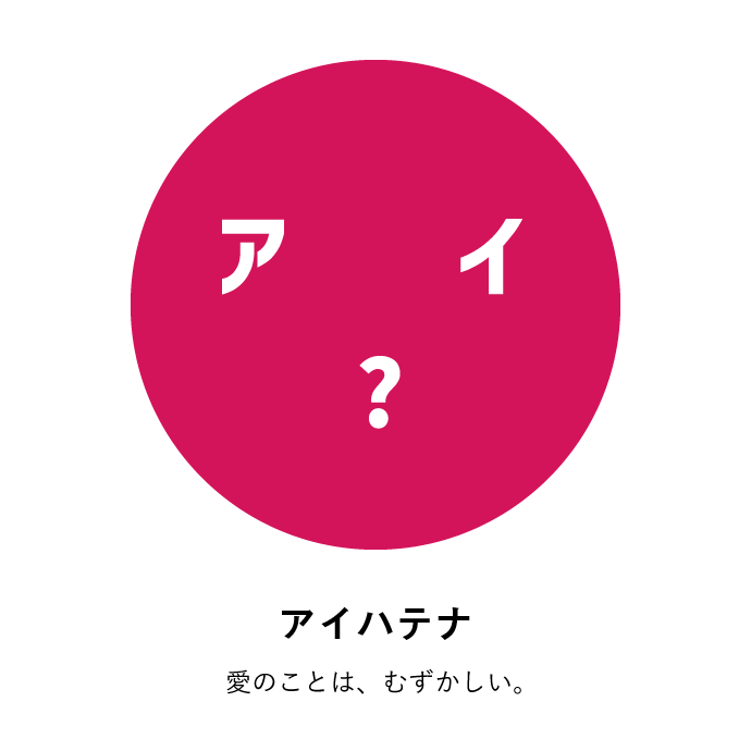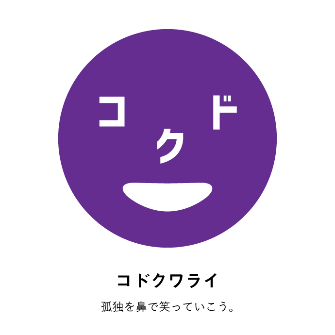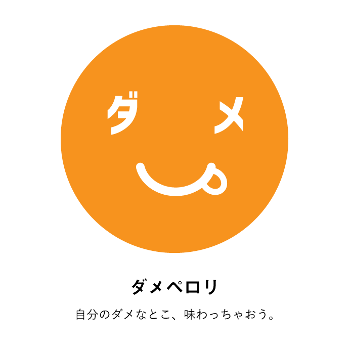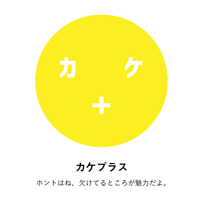 色のついた丸に、カタカナと記号で顔をつくったらカワイイじゃない?それで、ちょっと哲学チックな意味を持たせて、メッセージを発するものになったらよいなと。そんな想いが込められています。たとえば、イエローの「カケプラス」で言えば、欠けているところが、実は魅力になるんだよと。
