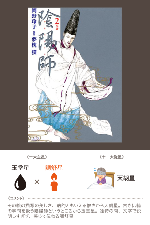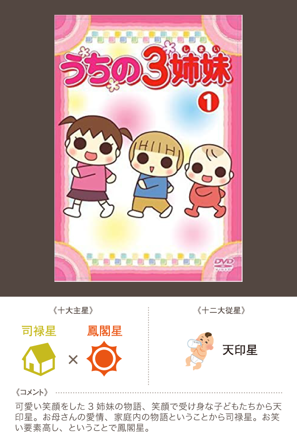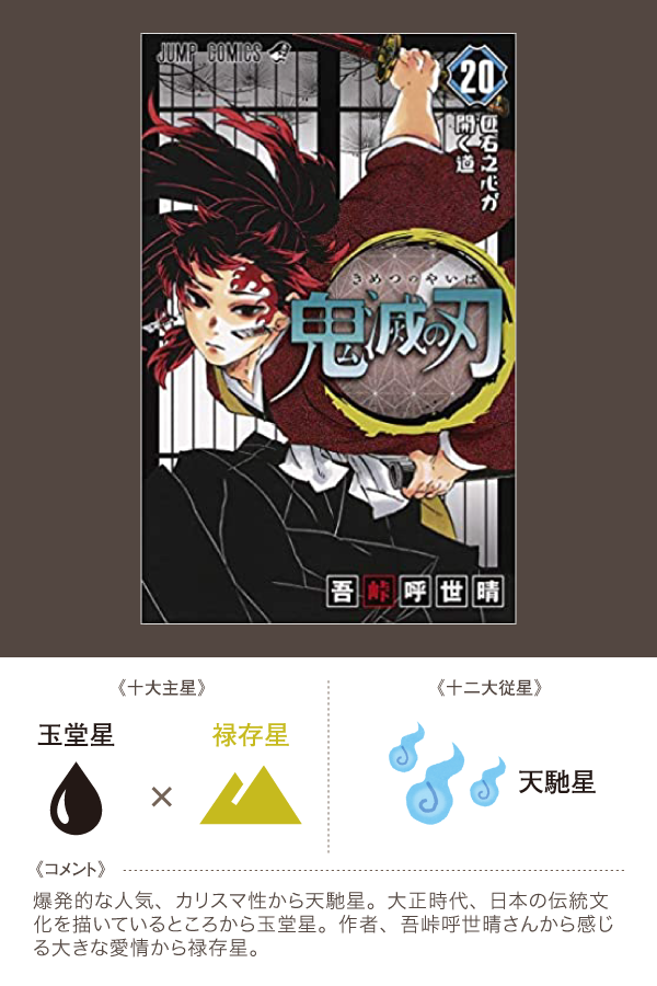 で!ですよ、陰陽五行論という難しい学問を学んでいて、その中の算命学をより理解してやるぞーというときに、マンガにたとえるということをしてみたんです。マンガ一つに対して、対応する十大主星を2つ、十二大従星を1つ選んでみます。例えば、鬼滅の刃であれば、玉堂星×禄存星そして天馳星だよね。その理由は・・・という具合に。
