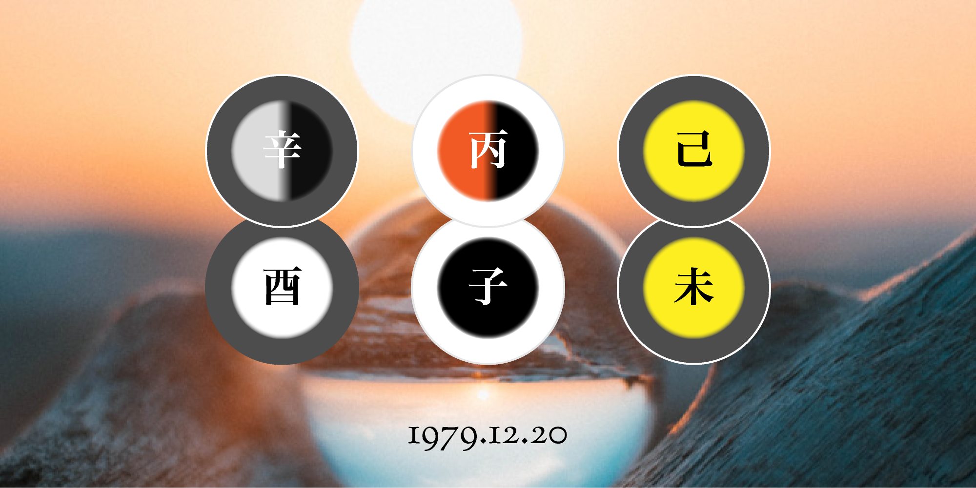なので、自分の宿命を元に、たとえや、意味合いを考えてデザインをしてみました。3枚ありますけど、夕日とガラス玉のが一番うまく表現できてるかなと思ってます。あと、丸の色だったり、グラデーションになっているところとか、深い意味があるんですが、マニアックになりそうなのでここまでとしておきます。