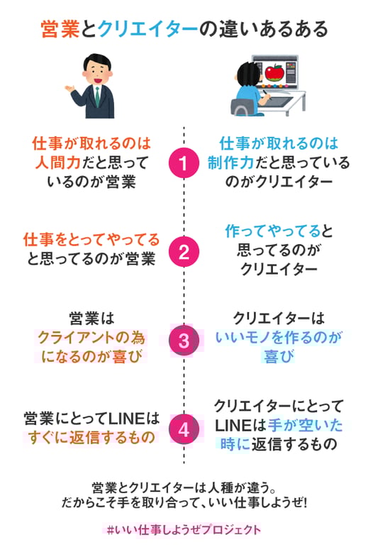 業界を見ていると、営業とクリエイターの間でケンカしちゃってるみたいなことがあるようで。でもそれって、お互いの理解が足りないだけだよね、仲良く力を合わせたほうが、クライアントのためになるよね。っていう想いで、「#いい仕事しようぜプロジェクト」なんて名前をつけてみました。