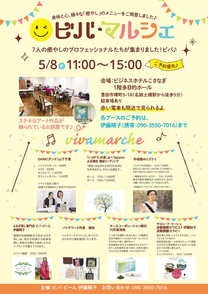 7人の癒やしのプロフェッショナルたちが集まるイベント、「ビバ・マルシェ」のイベント告知チラシをデザインさせていただきました。さりげなく、わたくしポエジーミズノも、手相読みミズケイとして名を連ねております(^^)v